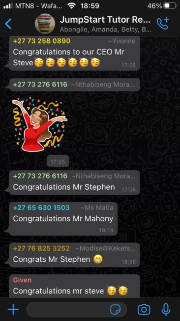 Steve leads this group under the “#ThinkingForward” slogan, a play on “Pay it forward”. Given his qualifications and extensive background in banking and software engineering, he could have taken a very different path. He chose instead to build a socially responsible and conscious group of social enterprises based on an ethos of service. Steve is driven by a personal desire to see children, unemployed youth, and staff develop their full potential. He longs to see people become the best they can be. He shared his gratitude to the tutors working in under-resourced classrooms in a WhatsApp message: